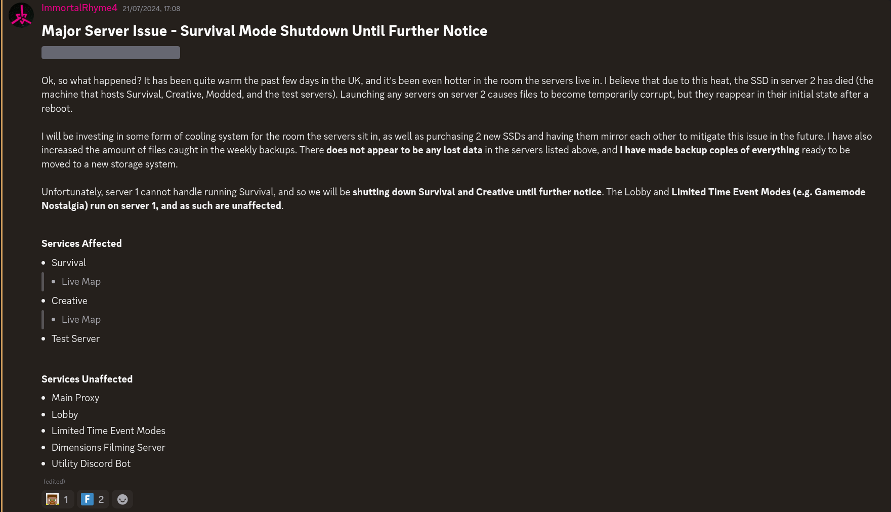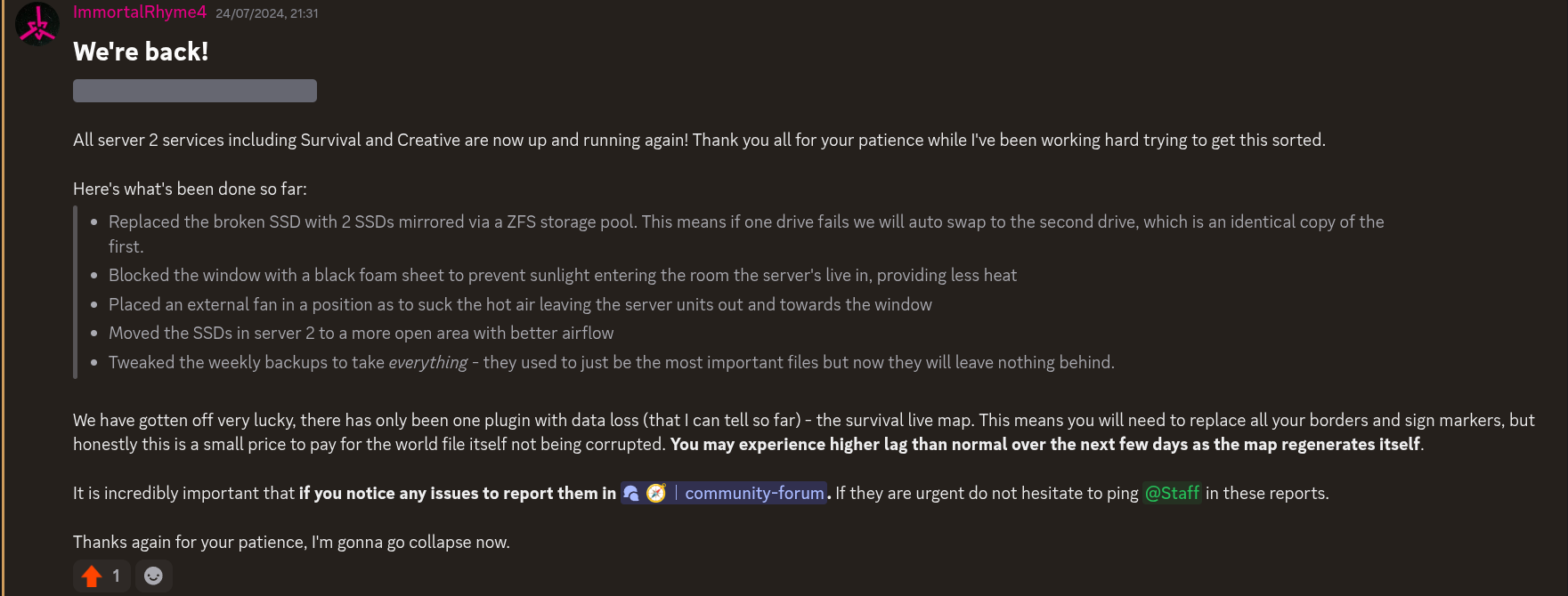 If you’ve been on the server a while you may remember that one time an SSD overheated and died on us, leading to me restoring worlds from a backup.